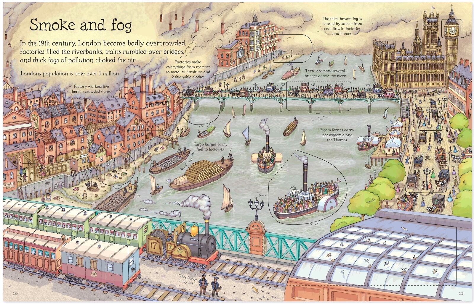 'Smoke and Fog.' A spread showing Victorian industry. From the flap book, 'See Inside London.' © Usborne Publishing.