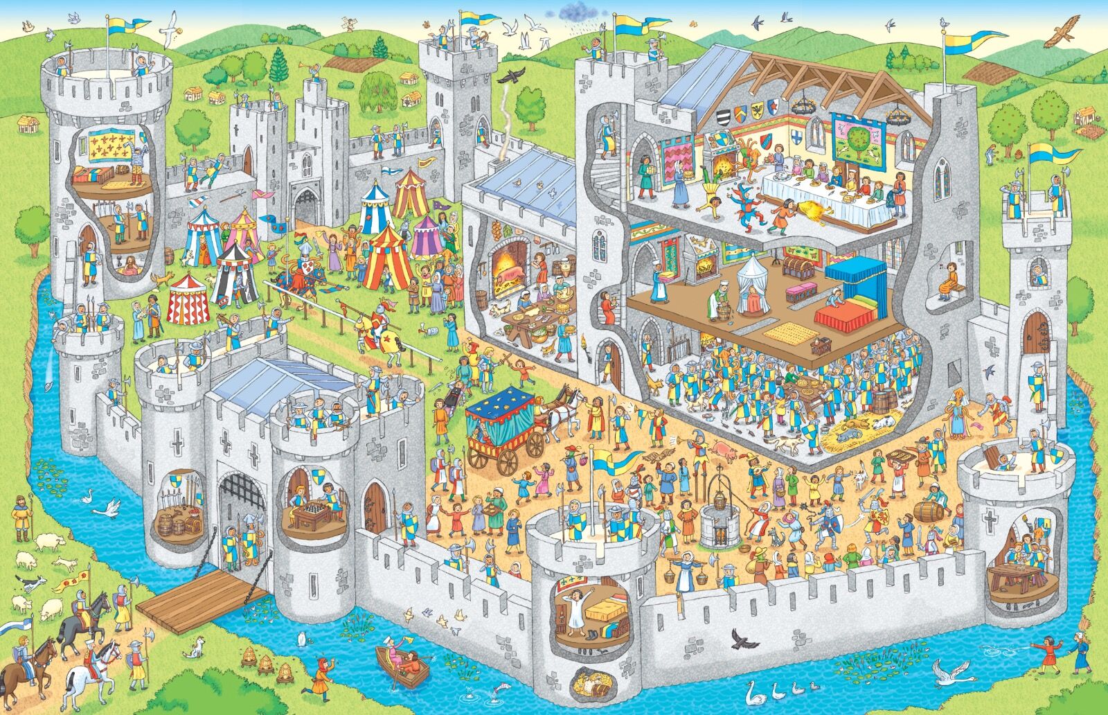 Medieval castle scene. Illustration from 'Secret Squid Storms the Castle'. A search and find history adventure book.
